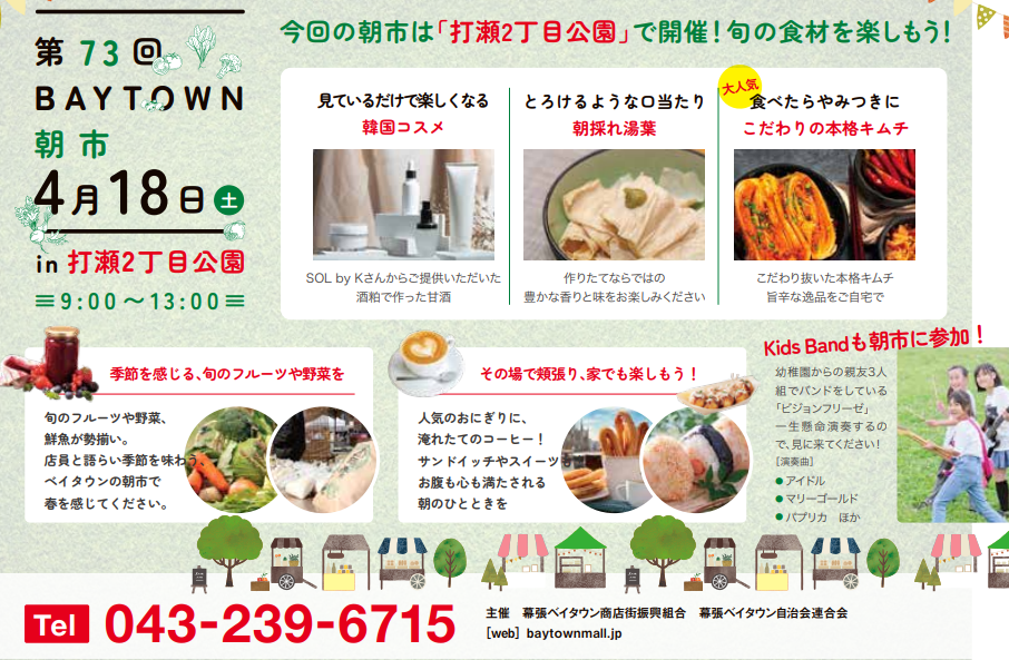 場所:打瀬2丁目公園 日時:2026年4月18日(土) 9:00~13:00 皆さん、こんにちは😊 新登場!韓国コスメや湯葉のお店等盛りだくさんです。 おなじみの朝市が、今回も… -